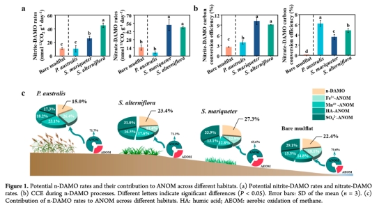意義:證實植被通過分泌有機酸降低pH、增加TOC,促進n-DAMO微生物活性,增強甲烷氧化能力。數(shù)據(jù)來源:圖1a(速率)、圖1b(CCE)。
