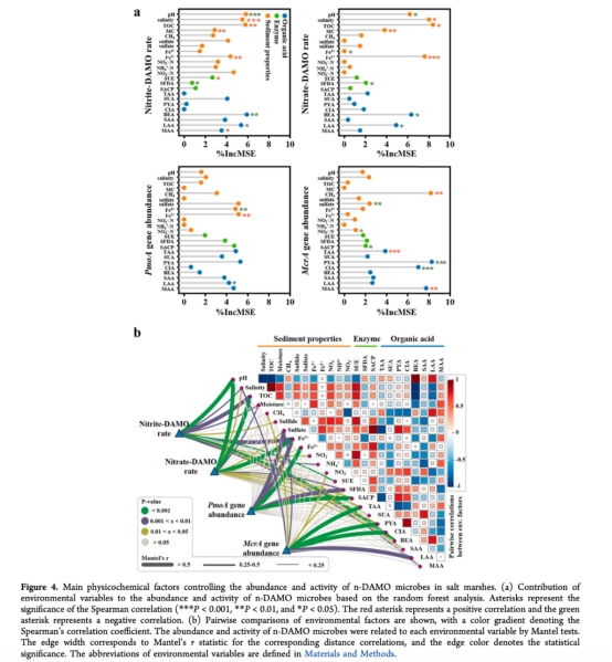 意義:植被根系分泌的有機酸(如丙酮酸、檸檬酸)降低pH,促進n-DAMO微生物底物利用。數(shù)據(jù)來源:圖4a(隨機森林分析)、圖4b(Mantel檢驗)。