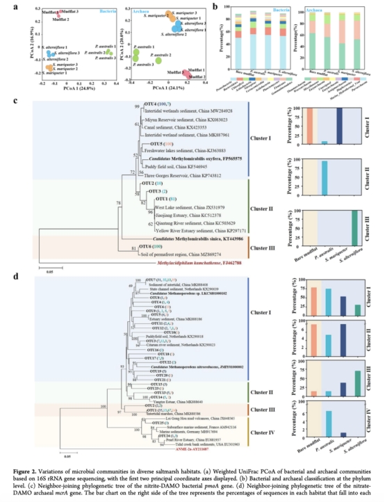 研究通過分子生物學(xué)和穩(wěn)定同位素示蹤技術(shù),揭示了不同鹽沼植被類型(如蘆葦、海三棱藨草、互花米草)及裸露泥灘中n-DAMO(亞硝酸鹽/硝酸鹽依賴的厭氧甲烷氧化)過程的生態(tài)功能差異及其微生物機制。結(jié)果表明,植被覆蓋的鹽沼(如海三棱藨草和互花米草)比裸露泥灘具有更高的n-DAMO速率(圖1a),顯著促進甲烷氧化;而蘆葦濕地中n-DAMO貢獻最低(15.0%),其厭氧甲烷氧化主要由Fe3?驅(qū)動(圖1c)。環(huán)境參數(shù)(如pH、總有機碳TOC、鹽度)和微生物群落結(jié)構(gòu)差異是調(diào)控n-DAMO過程的關(guān)鍵因素(圖4)。研究估算了中國沿海濕地n-DAMO每年可氧化1.8-22.6×10?噸甲烷,為濕地甲烷減排提供了科學(xué)依據(jù)。