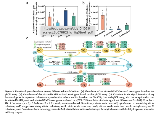 意義:群落結(jié)構(gòu)差異(如互花米草區(qū)以Cluster III古菌為主)導(dǎo)致不同植被區(qū)n-DAMO功能分化。數(shù)據(jù)來源:圖2(系統(tǒng)發(fā)育樹)、圖3(qPCR)。