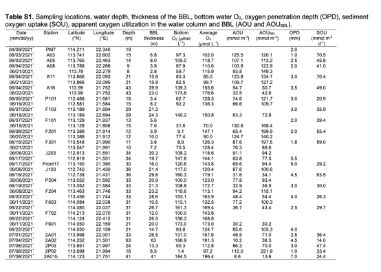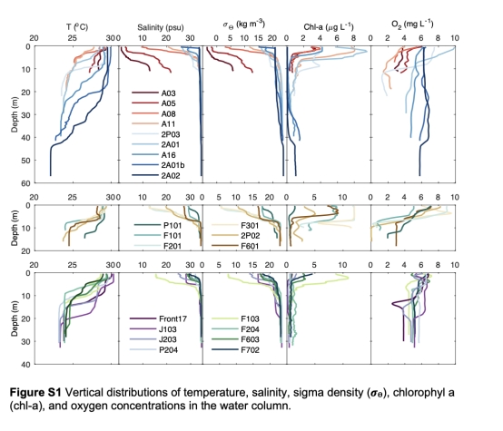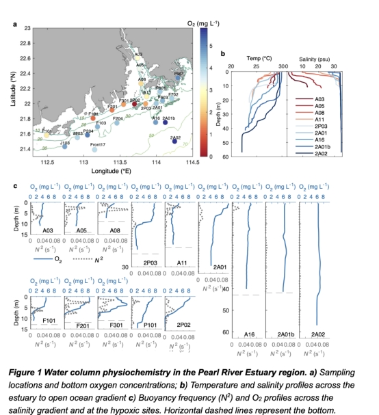 (1)水柱數據(溫度、鹽度、密度、溶解氧,圖1和表S1):揭示分層對底部氧氣補給的限制作用。