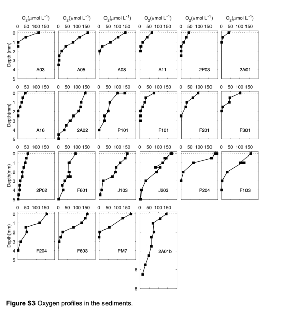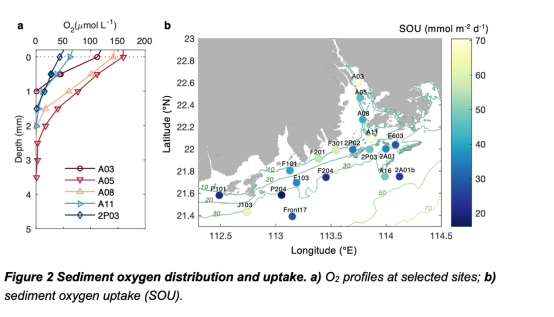 微剖面技術(0.5–1 mm分辨率)精確測定沉積物-水界面氧梯度(圖2a),顯示氧滲透深度僅2–7 mm(表S1),表明劇烈氧消耗。