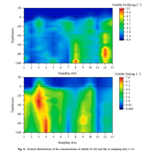 藻類區硫酸鹽還原促進Fe(II)與S2?形成硫化鐵沉淀,降低Fe(II)濃度,但Mn因硫化錳不穩定仍保持較高溶解態。