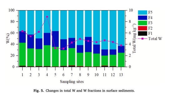 通過連續提取法分析沉積物中鎢的化學形態(圖5、表1)。