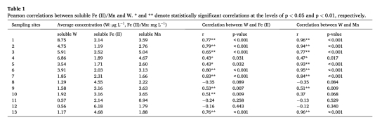 該研究探討了不同生境(藻類主導區與水生植物主導區)下湖泊沉積物中鎢(W)的遷移特性。發現藻類主導區的孔隙水中溶解態鎢的濃度和釋放通量顯著高于水生植物區,原因是藻源溶解有機質(DOM)與鎢競爭吸附位點,同時DOM促進鐵(Fe)/錳(Mn)氧化物的還原溶解,導致鎢釋放。水生植物通過吸收鎢和原位形成Fe(III)/Mn(IV)氧化物抑制鎢釋放。結論指出,水生植物能有效控制沉積物中鎢的釋放。