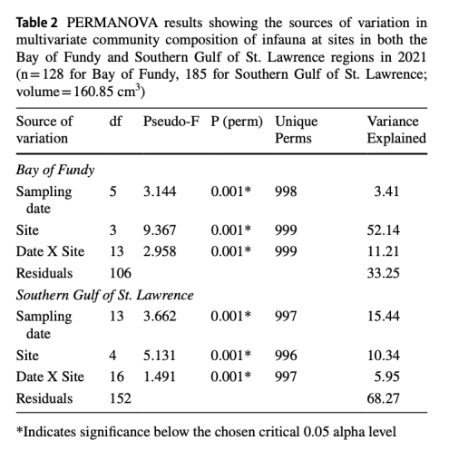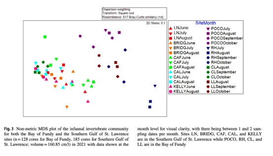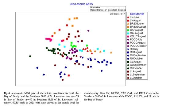 該研究探討了水體(如鹽度、溫度)和沉積物(如粒度、碳酸鹽化學參數)的非生物條件對潮間帶底棲無脊椎動物群落及雙殼類幼體豐度的影響。研究區域位于加拿大新不倫瑞克省的兩個海洋環境差異顯著的區域——芬迪灣(高潮差)和圣勞倫斯灣南部(低潮差)。通過2020-2021年的數據,采用多變量和單變量統計模型分析發現,碳酸鹽化學參數(沉積物pH、水體/沉積物堿度)是解釋底棲群落組成和生物指標(物種豐富度、總豐度、雙殼類豐度)的重要驅動因素。在芬迪灣,沉積物pH解釋了16.9%的群落變異,而在圣勞倫斯灣南部,鹽度是主要驅動因素(9.8%)。研究指出,未來海洋酸化可能通過改變碳酸鹽化學條件(如pH和堿度)顯著影響底棲生物群落。