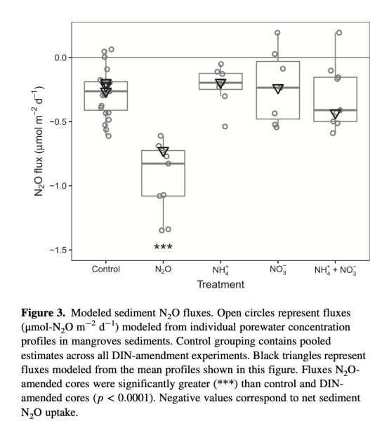 量化通量與模型驗證:結合PROFILE模型,計算N2O通量(圖3)和產消速率,證明紅樹林的凈吸收(-0.22至-0.30 μmol m?2 d?1)與nosZII活性直接相關。