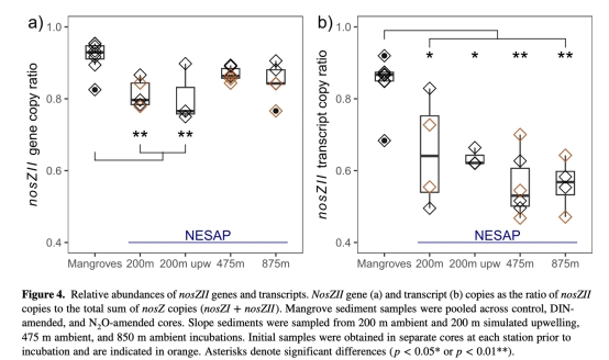 探究海洋沉積物中微生物群落動態與N2O循環的關系,比較低氮紅樹林與高氮大陸邊緣沉積物的N2O代謝差異,闡明非典型nosZII基因在調控N2O消耗中的作用。