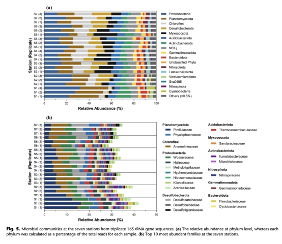 該研究聚焦新西蘭東北部寡營養大陸架沉積物的氮循環過程,發現反硝化是主要氮去除途徑(65–284 μmol N m?2 d?1),厭氧氨氧化貢獻較小(2–19%),DNRA幾乎可忽略。研究結合微生物群落分析,發現變形菌門(Proteobacteria)和浮霉菌門(Planctomycetota)是驅動反硝化的關鍵類群,反硝化速率與氧滲透深度負相關,與宏體動物豐度正相關。全球數據對比顯示,傳統高估了大陸架脫氮作用(原估20%海洋脫氮,修正為53.5±8.1 Tg N yr?1),主因采樣偏向北半球富營養化區域。