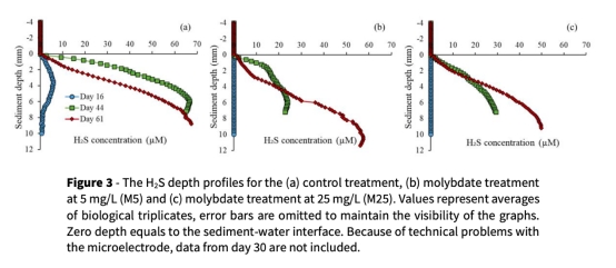 鉬酸鹽(尤其是25 mg/L劑量)顯著降低沉積物表層H?S濃度,將高硫區(qū)推向更深層(圖3),延緩硫化物向水體擴(kuò)散(圖1b)。