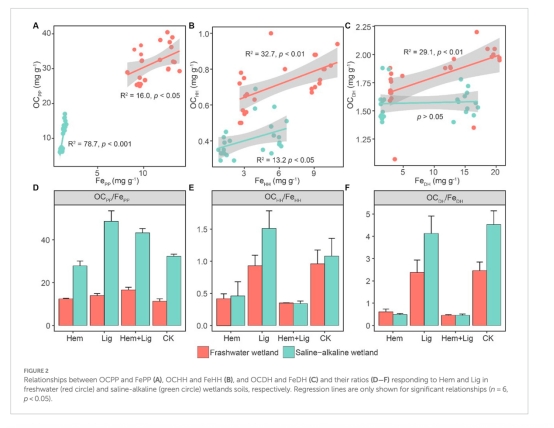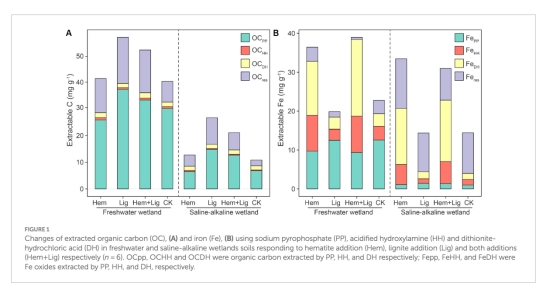 研究通過淡水濕地(富碳鐵)和鹽堿濕地(貧碳鐵)的厭氧培養實驗,探究赤鐵礦(Hem)和褐煤(Lig)添加對土壤有機碳平衡的影響。結果表明:Lig通過促進鐵結合有機碳(Fe-OC)形成導致凈碳積累(淡水濕地:5.9±3.6 mg g?1;鹽堿濕地:8.3±3.2 mg g?1),而Hem通過改變微生物群落結構顯著增加有機碳礦化(尤其在淡水濕地)。結晶態鐵氧化物單獨添加會增強碳礦化,但老碳(富含芳香族和烷基化合物)能促進Fe-OC形成并提高碳持久性。