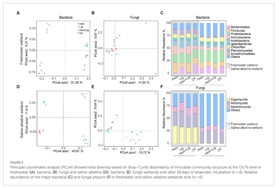 實驗設計:選取淡水濕地(FW)和鹽堿濕地(SW)土壤,設置四組處理(對照、Hem添加、Lig添加、Hem+Lig添加),進行63天厭氧培養。