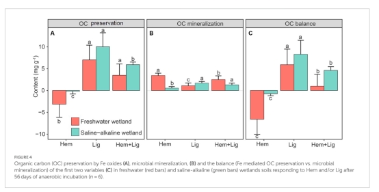碳保存與礦化平衡:Lig通過形成Fe-OC實現凈碳積累,Hem則因改變微生物群落導致碳損失(圖4)。
