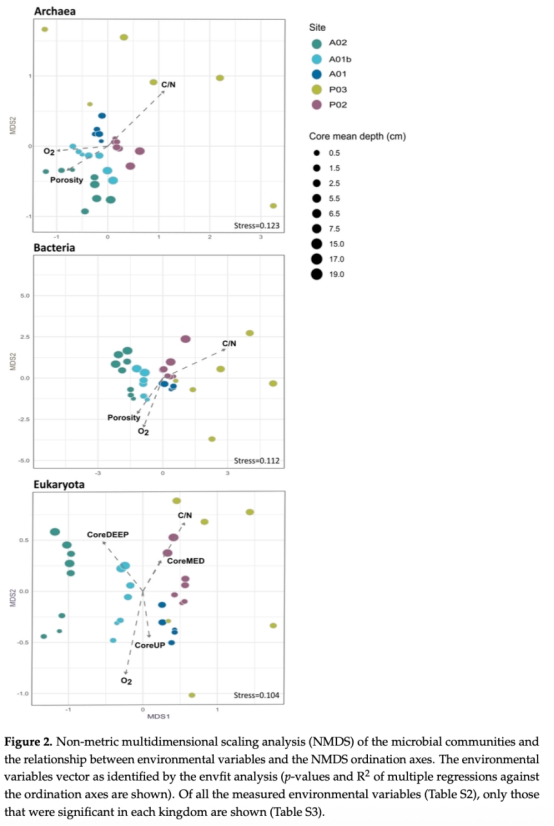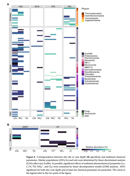 該研究分析了珠江口(PRE)及鄰近陸架沉積物中細(xì)菌、古菌和真核生物的組成、多樣性及分布模式,探討了環(huán)境參數(shù)(如氧濃度、氮化合物、碳含量)對微生物群落的影響。研究發(fā)現(xiàn),微生物群落結(jié)構(gòu)主要受采樣點(diǎn)位置和沉積物核心深度驅(qū)動(dòng),兩者共解釋了約67%的群落變異。不同站點(diǎn)和深度的沉積物特性(如有機(jī)質(zhì)含量、氧化還原條件)導(dǎo)致特定微生物類群與化學(xué)參數(shù)(如C/N比、NH4+濃度)顯著相關(guān)。盡管存在差異,各站點(diǎn)均存在優(yōu)勢類群(如細(xì)菌中的Gammaproteobacteria,古菌中的Bathyarchaeia)。P03站點(diǎn)的微生物多樣性(三個(gè)類群)顯著低于其他站點(diǎn)。