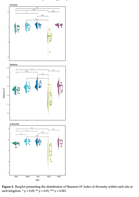 微生物多樣性(圖5):Shannon指數(shù)顯示細(xì)菌多樣性最高,P03站點(diǎn)多樣性最低,提示該區(qū)域環(huán)境壓力顯著。