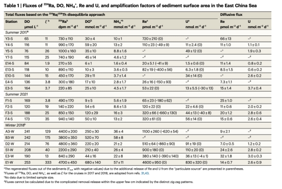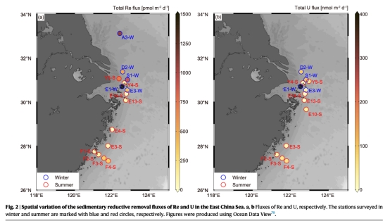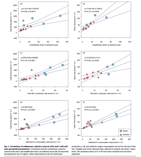 大陸架沉積物Re/U還原去除通量與有機(jī)碳分解速率直接相關(guān),冬季強(qiáng)混合促進(jìn)通量提升3-4倍(表1對比夏冬季數(shù)據(jù))。