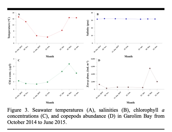 采樣與實驗設計:在Garolim灣進行月度采樣,記錄溫度、鹽度、葉綠素a濃度及橈足類豐度(圖3、4);