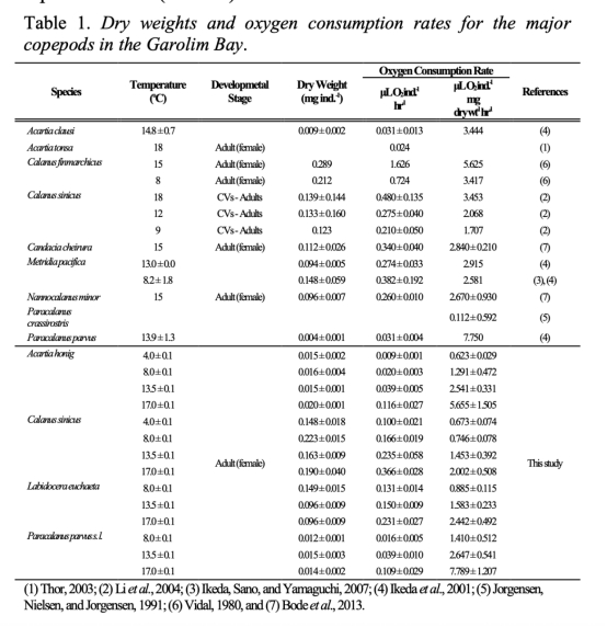 測定黃海Garolim灣優勢橈足類的呼吸速率;