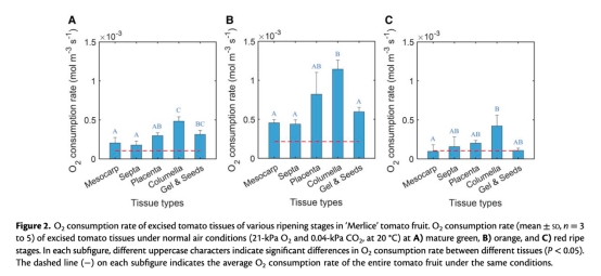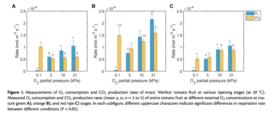 完整果實的呼吸速率(圖1):測量了不同成熟階段(綠熟、橙熟、紅熟)在不同外部氧氣濃度下的氧氣消耗和二氧化碳生成速率。意義:揭示呼吸速率的階段性變化及其對缺氧的敏感性。
