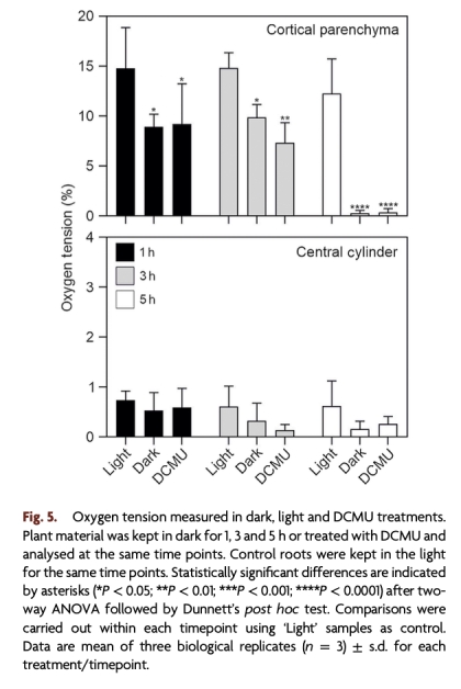 黑暗或抑制光合作用(DCMU處理)導致根部皮層缺氧(氧氣<1%),激活缺氧響應基因。