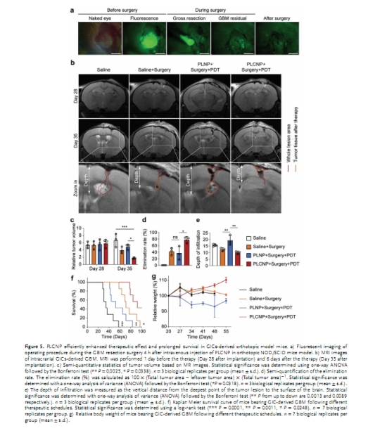 腫瘤體積:PLCNP+手術+PDT組腫瘤體積縮小73.83%(圖5c)。