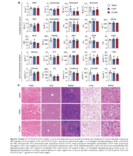 安全性與臨床潛力:低劑量(5 mg/kg卟啉脂質)即可顯著延長生存期,且無顯著毒性(圖6)。