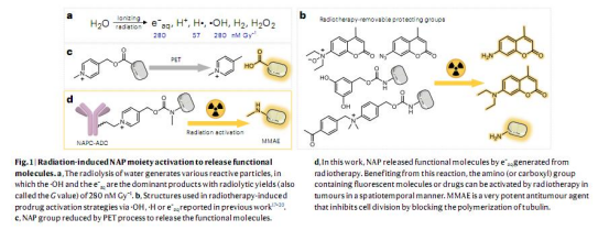 本文提出了一種基于放療激活的吡啶鎓前藥(NAP)系統,通過結合光誘導電子轉移(PET)化學與放療技術,開發了一種新型的輻射可移除保護基團。該保護基團(NAP)在放療產生的水合電子(e?aq)作用下高效釋放功能分子(如熒光染料或毒素),并成功應用于抗體藥物偶聯物(ADC)。實驗表明,NAP在放療下的釋放效率優于現有保護基團,且設計的ADC在細胞和荷瘤小鼠中展現出顯著的抗腫瘤效果,為下一代ADC的開發提供了新思路。