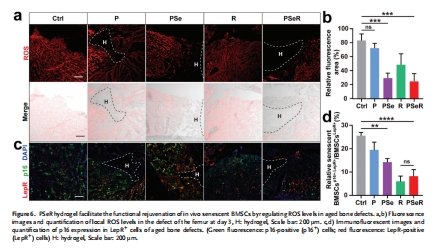 圖6c-d:免疫熒光顯示PSeR使衰老BMSCs(p16?LepR?)比例從25.6%降至8.2%。