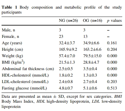 BMI與代謝指標 表1 OW組腹部脂肪更厚、HDL更低,提示肥胖伴隨代謝紊亂。