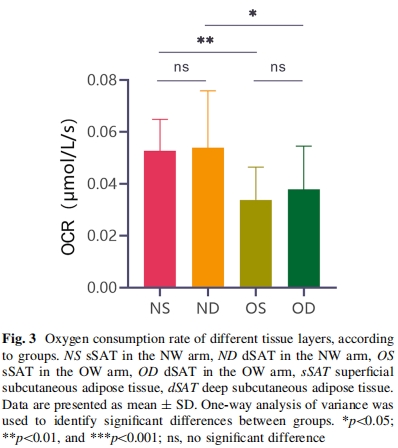 方法:按BMI將腹部吸脂手術患者分為正常體重組(NW, BMI 18–24 kg/m2)和超重肥胖組(OW, BMI>24 kg/m2),測量淺層(sSAT)與深層皮下脂肪(dSAT)的氧濃度、耗氧率(OCR)、脂肪細胞面積和毛細血管密度。
