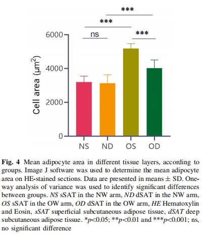 脂肪細胞面積 圖4 OW組細胞面積顯著大于NW組;sSAT細胞面積大于dSAT(僅OW組)。說明細胞肥大阻礙氧擴散,導致缺氧。