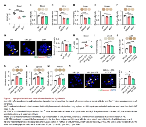圖1A-B, E-N:凋亡缺陷小鼠(MRL/lpr、Bim?/?)血液/組織中H?S↓;STS誘導(dǎo)凋亡后H?S↑,Z-VAD(凋亡抑制劑)阻斷此效應(yīng)。