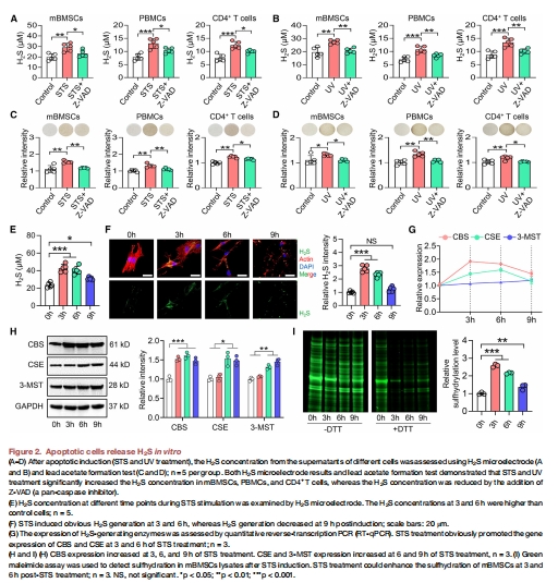 圖2A-B:量化凋亡細(xì)胞上清H?S濃度(STS/UV處理后↑,Z-VAD抑制)。