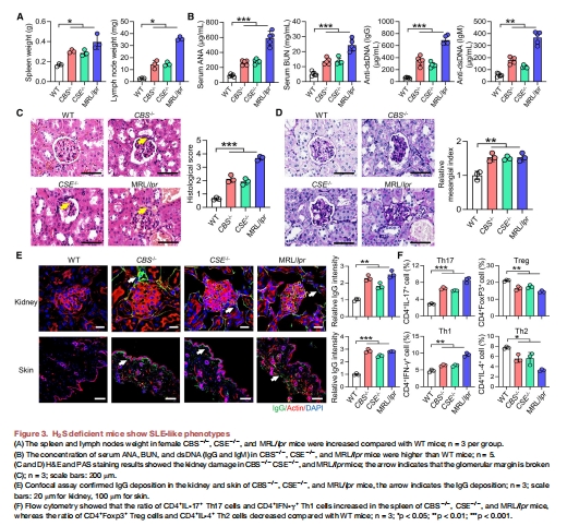 圖3:H?S缺陷小鼠(CBS?/?、CSE?/?)出現(xiàn)SLE表型(脾/淋巴結(jié)腫大↑、ANA/dsDNA↑、腎損傷、Th17↑)。