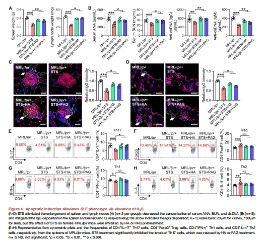圖4A-D, S3:STS誘導(dǎo)凋亡改善SLE表型,但H?S抑制劑(HA/PAG)阻斷療效。