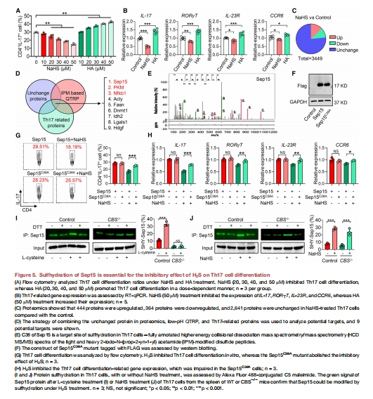 圖4E-H, 5A-B:H?S(NaHS)抑制Th17分化(流式+基因表達(dá)↓),H?S抑制劑(HA)促進(jìn)分化。