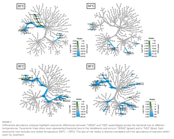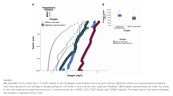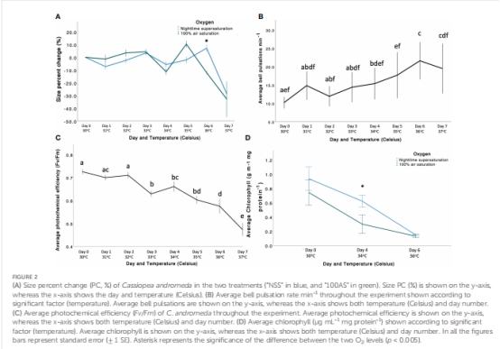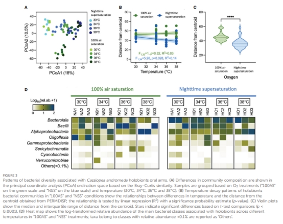 論文通過實驗證明:氧氣過飽和(O? supersaturation)可增強倒立水母(Cassiopea andromeda)-蟲黃藻(Symbiodiniaceae)共生體對中等升溫的抵抗力。在亞致死溫度下(≤36°C),夜間氧氣過飽和(NSS組)使水母體型縮小減輕約10.37%,葉綠素a損失減少42.73%(至34°C),并富集有益菌群,提升微生物組穩(wěn)定性。超過34-36°C后,熱應激效應主導,氧氣效益消失。