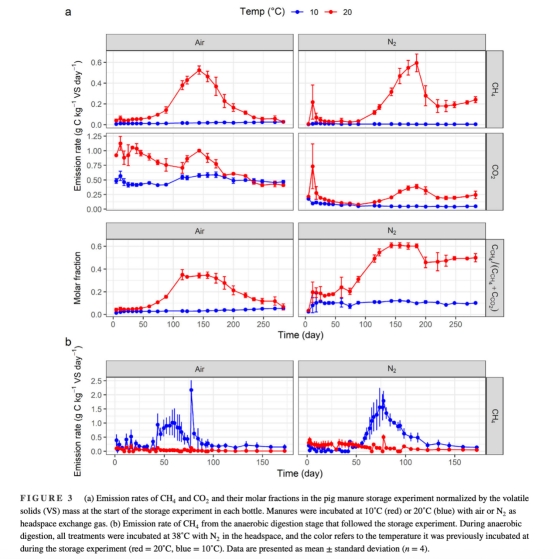 儲存實驗:豬糞在10°C或20°C下,分別暴露于好氧(空氣)或厭氧(N?)環境283天,監測CH?和CO?排放。