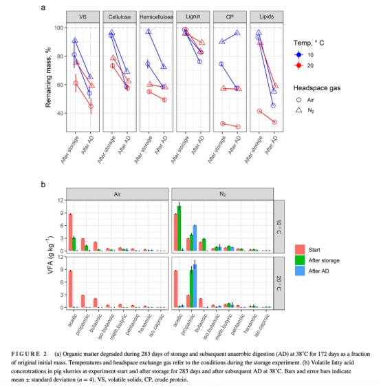 好氧條件下CO?排放顯著高于厭氧條件(20°C+空氣:226 g C kg VS?1 vs. 20°C+N?:66.4 g C kg VS?1)。