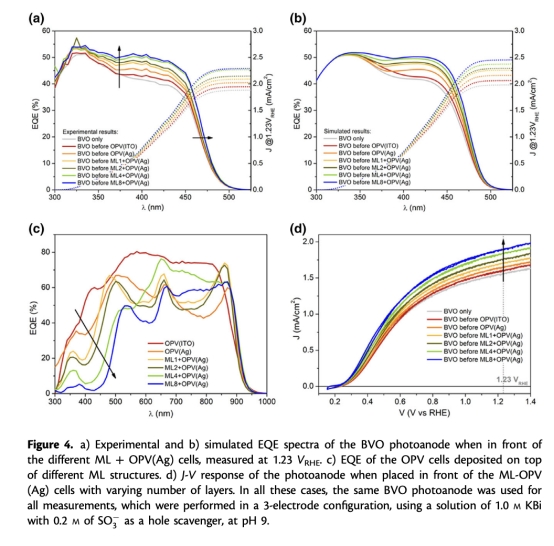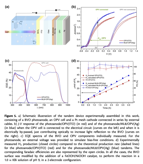 器件集成:將BiVO?光陽極與ML-OPV(Ag)串聯,表面沉積FeOOH/NiOOH催化劑提升析氧反應活性(圖5a)。