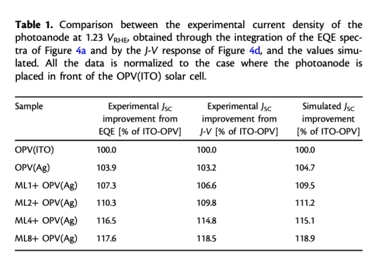 意義:ML8-OPV(Ag)使無偏壓電流密度達1.57 mA·cm?2,氫氣產率提升25%(9.9 vs. 7.8),STH效率達1.93%。