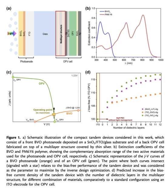 該研究設計并實現了一種緊湊型串聯結構,結合高透明度的BiVO?光陽極和帶隙為1.3 eV的PM6:Y6有機太陽能電池(OPV)。通過引入光子多層結構(TiO?/SiO?交替)優化光吸收分布,使BiVO?在短波長區域的光吸收顯著增強,同時減少OPV在紫外區的無效吸收。這種設計使無偏壓太陽能-氫能(STH)轉換效率提升25%,達到1.93%,為緊湊型串聯光電器件逼近理論極限效率(~20%)提供了新路徑。