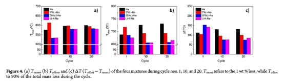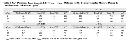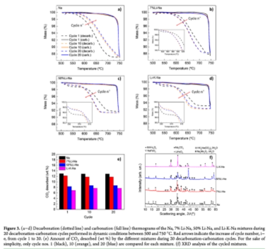 熱重?cái)?shù)據(jù)(圖3, 8a):量化CO?釋放/吸收質(zhì)量變化(表3-4),反映脫碳/碳酸化反應(yīng)程度。意義:直接評估循環(huán)可逆性,揭示含鋰混合物首周期后容量驟降(如50%Li-Na從15.2wt%降至6wt%)。
