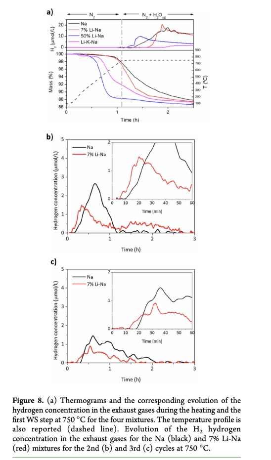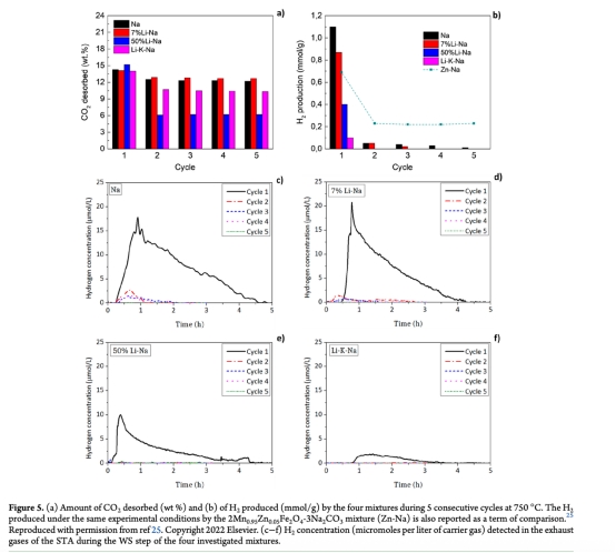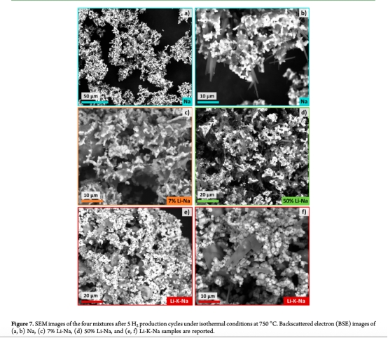 動力學(xué)機(jī)制解析:直接關(guān)聯(lián)產(chǎn)氫速率與反應(yīng)進(jìn)程。例如圖8a顯示7%Li-Na在第二周期比Na混合物早5分鐘啟動產(chǎn)氫,且峰值前移,證明熔融碳酸鹽在等溫再生步驟(750°C)形成液相,加速了水分解反應(yīng)的離子遷移(圖9)。