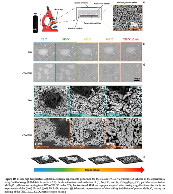 原位光學(xué)顯微(圖10):實(shí)時(shí)追蹤加熱過程。意義:直接驗(yàn)證7%Li-Na在750°C下熔融并滲透多孔MnFe?O?(圖10c,j),解釋動力學(xué)提升但燒結(jié)加劇的矛盾。
