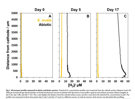 高分辨率動態監測:Unisense微傳感器以25 μm步進分辨率捕捉陰極附近H?梯度(圖3),首次直接證實 S. ovata 在陰極表面高效消耗H?(濃度始終<4 μM),而傳統GC僅能檢測頂空氣體,無法反映液相微環境動態。