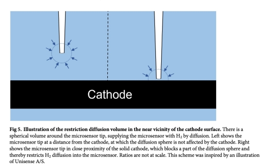 微傳感器在固體陰極表面附近的測量值可能因擴散受限而失真(圖5),建議測量點距陰極表面至少兩倍于傳感器尖端直徑(>50 μm)。