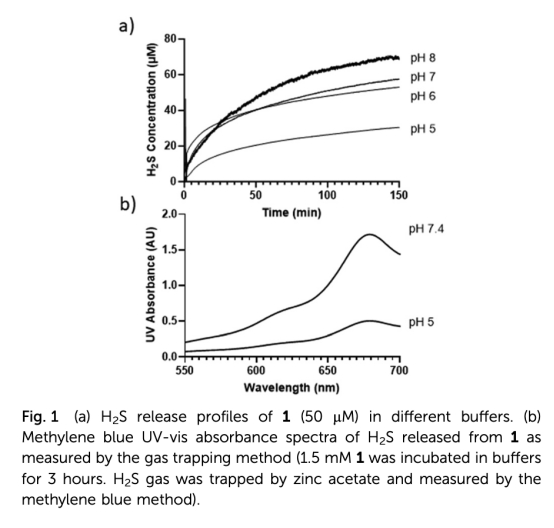揭示pH依賴性機制:數據顯示H?S釋放量隨pH升高而增加(pH 5: 30 μM → pH 8: 68 μM),支持1通過堿促進的消除反應生成H?S和硫酮5的路徑(Scheme 3),為優化供體效率提供參數指導。