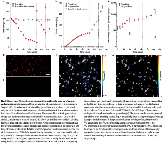發現:首次證實完全氨氧化菌(comammox)Nitrospira inopinata 能以胍(guanidine)作為唯一能源、電子供體和氮源實現化能自養生長(圖3f,g)。