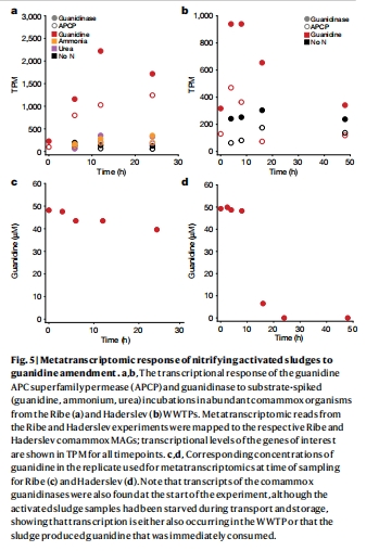 污水廠轉錄組 圖5a,b(胍酶基因TPM值) 胍添加后comammox胍酶和轉運蛋白基因表達上調2.6倍(Padj<10-8),證實環境中的功能活性。